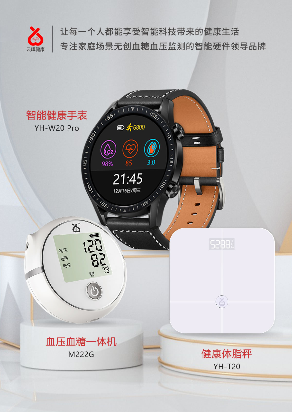 云暉健康利用自研的智能手表、血壓血糖一體機、健康體脂秤、血脂尿酸測試儀等多種智能設備的大數(shù)據(jù)融合算法建立個性化的用戶健康畫像,從而實現(xiàn)無創(chuàng)血壓血糖趨勢監(jiān)測以及心腦血糖和代謝類疾病的早期風險預警。