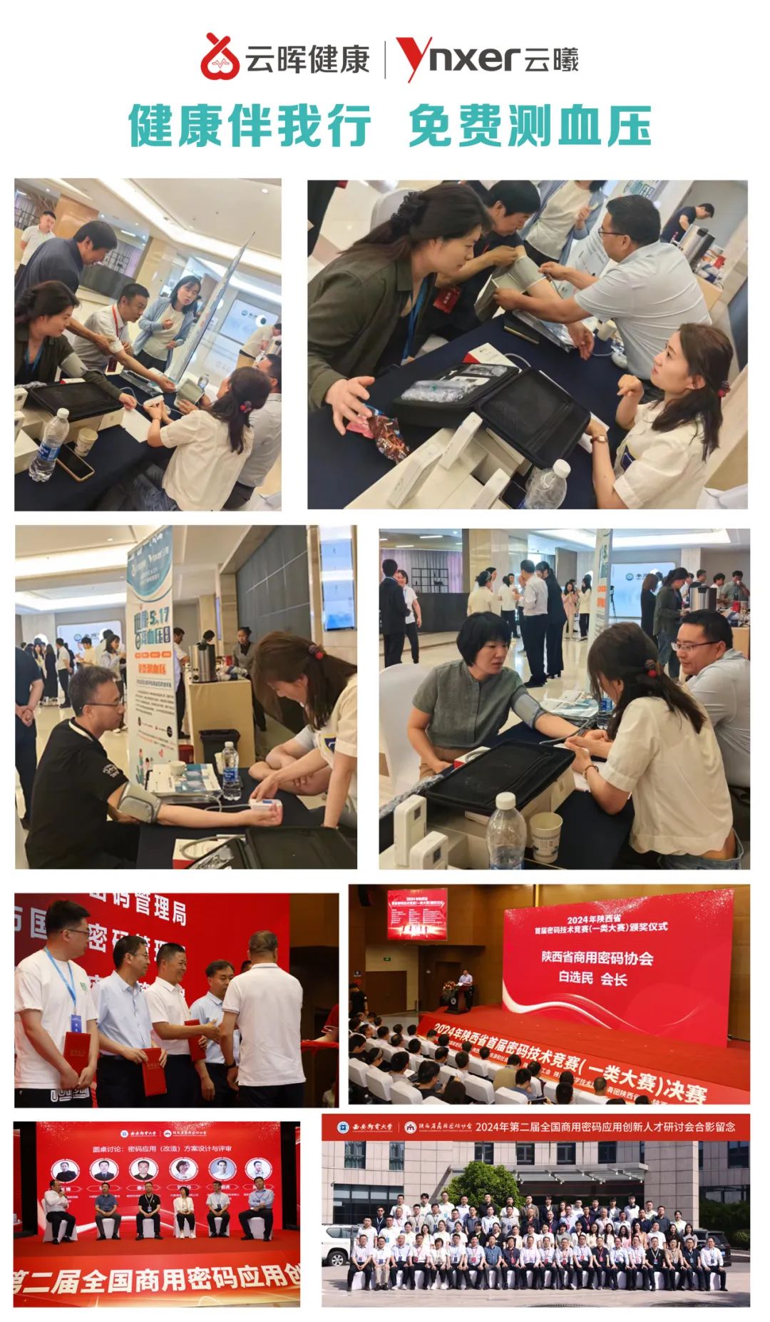 2024年5月17日是第20個世界高血壓日,主題為“精準測量,有效控制,健康長壽”。為推動我國高血壓防控工作,增強全民自我管理、預防為先、降壓達標的意識,云暉健康聯(lián)合秦商密在2024年第二屆全國商用密碼應用創(chuàng)新人才研討會暨陜西省首屆密碼技術競賽決賽期間組織開展“健康伴我行,免費測血壓”活動,以提高高校教授老師、專家學者、研究員、學生、企業(yè)技術員等人員,對于高血壓的防控意識。活動從2024年5月17日開始,于5月19日結束。在活動期間,我們醫(yī)療器械專業(yè)顧問、咨詢師和檢驗師使用云曦24小時動態(tài)血壓監(jiān)測儀為陜西省國家密碼管理局強國宏局長、中國密碼學會密碼教育與科普委員會主任委員李子臣教授、西安郵電大學副校長苗忠教授、陜西省商用密碼協(xié)會白選民會長、陜西省國家密碼管理局商密處王勇衛(wèi)處長、密碼科技國家工程研究中心秦小龍總工程師、秦商密(陜西)密碼工程技術有限公司朱勛技術總監(jiān)等人進行血壓講解和檢測,在血壓測量間隙,提醒家用電子醫(yī)療器械的使用規(guī)范,將精準測量,有效控制,健康長壽主題融入到活動的整個過程中。
