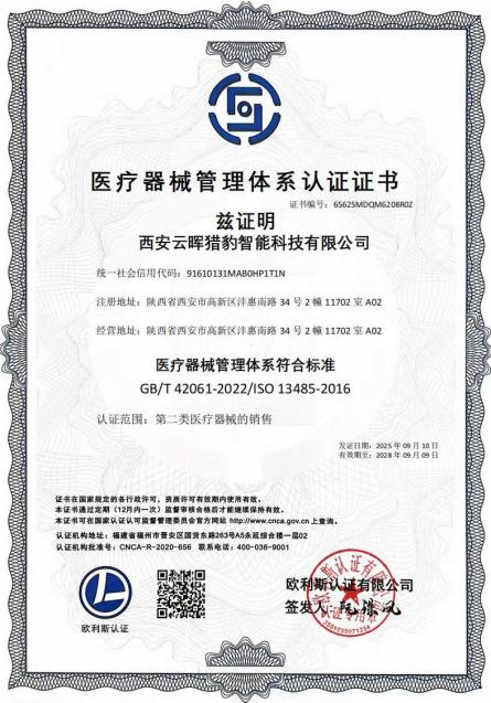 熱烈祝賀西安云暉獵豹智能科技有限公司成功通過(guò)國(guó)家認(rèn)監(jiān)委權(quán)威認(rèn)證,榮獲ISO 13485醫(yī)療器械質(zhì)量管理體系證書(shū)!這一重要成就標(biāo)志著云暉健康在醫(yī)療器械質(zhì)量管理領(lǐng)域邁上了新的臺(tái)階,為公司未來(lái)發(fā)展奠定了堅(jiān)實(shí)基礎(chǔ)。